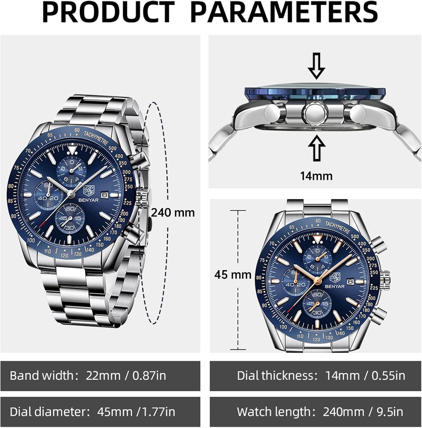 La montre BY BENYAR a été conçue avec soin pour capturer l’essence du charme classique tout en répondant aux exigences modernes. Elle arbore un boîtier en acier inoxydable de 45 mm, qui abrite trois cadrans secondaires multifonctionnels.