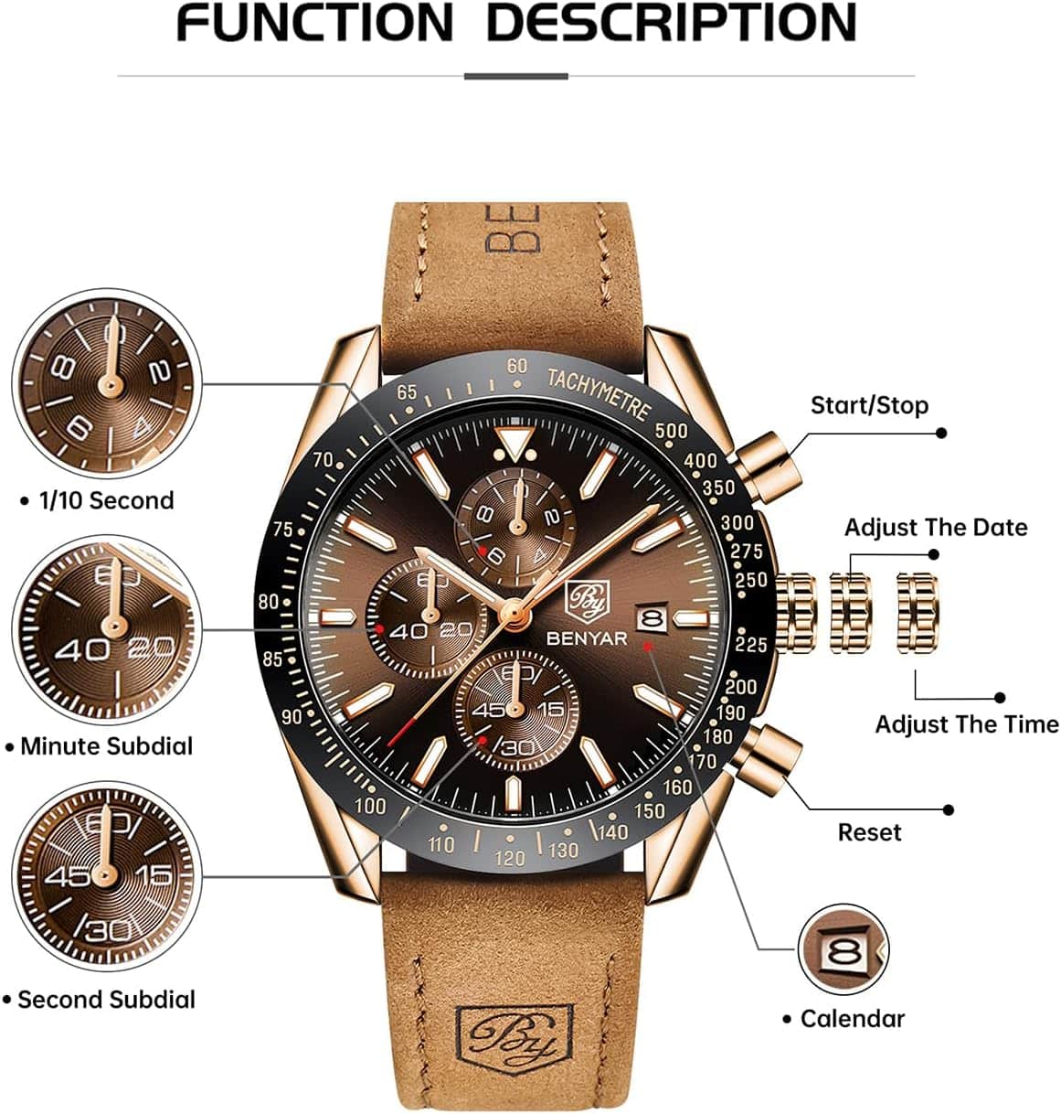 Outre son apparence élégante, la montre BENYAR est dotée de fonctionnalités parfaitement adaptées au quotidien. Le mouvement à quartz garantit une précision infaillible, vous permettant de rester ponctuel à chaque instant. De plus, son chronographe intégré offre des fonctions de mesure du temps additionnelles, idéales pour les activités sportives ou les challenges personnels. Sa résistance à l’eau de 3 Bar vous assure une tranquillité d’esprit lors de petites immersions, que ce soit sous la pluie ou lors d’activités nautiques modérées.